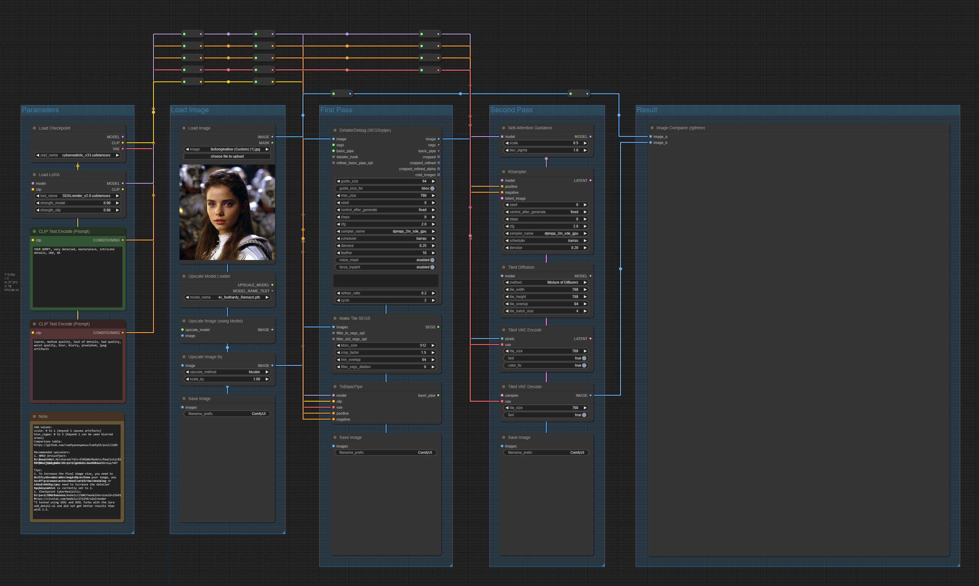 Currently, my focus has shifted more to tools like Clarity Upscaler and ultimately Magnific AI. However, moving the Automatic1111 workflow to ComfyUI has not been successful because the Tiled Diffusion nodes work differently. If anyone finds a way to achieve this, please let me know and I'll be happy to update the workflow.