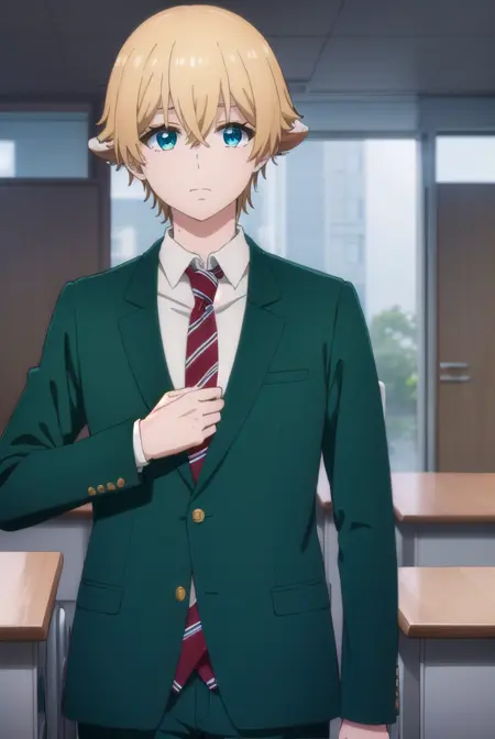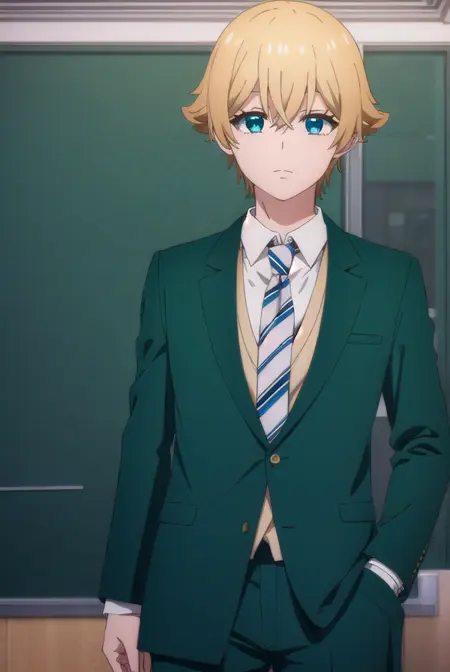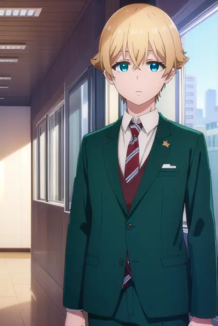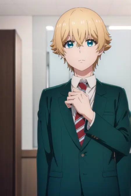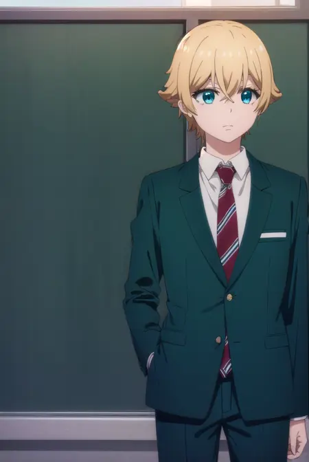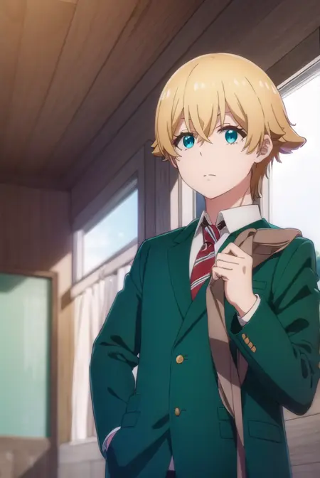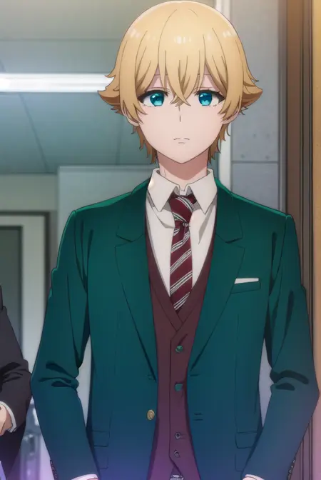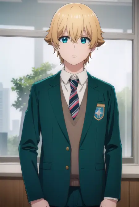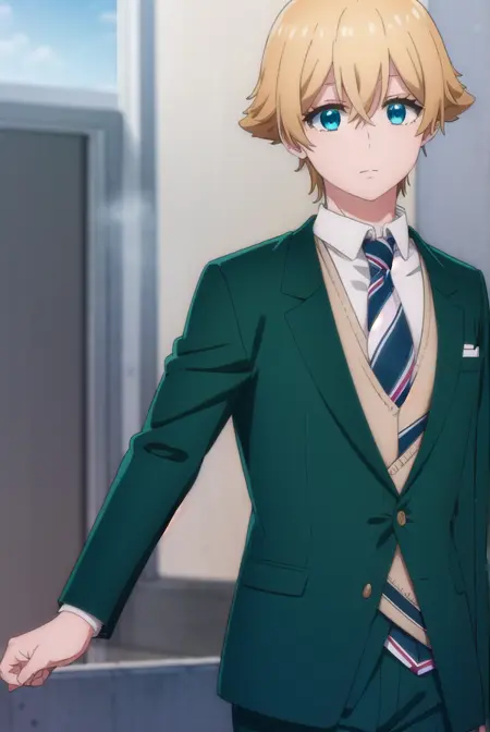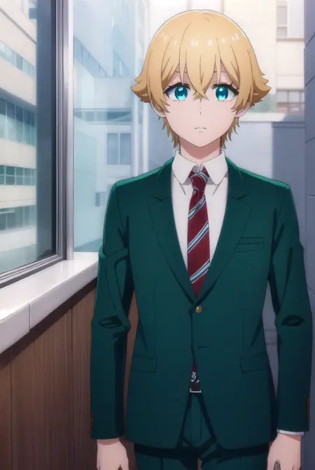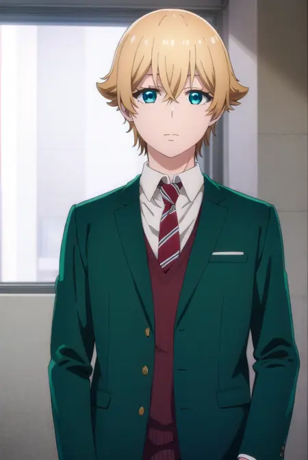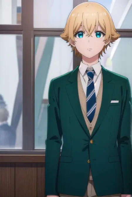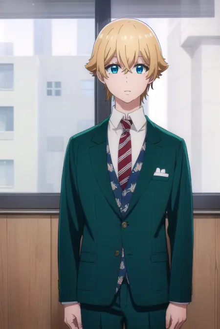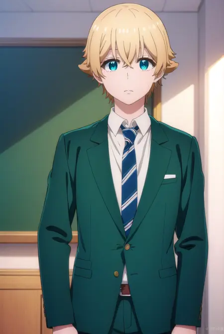 kousuke misaki、短い髪、青い目、金髪、目の間の髪、