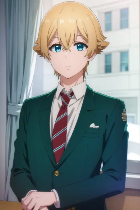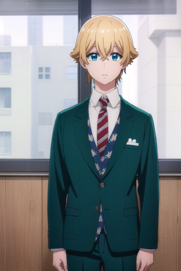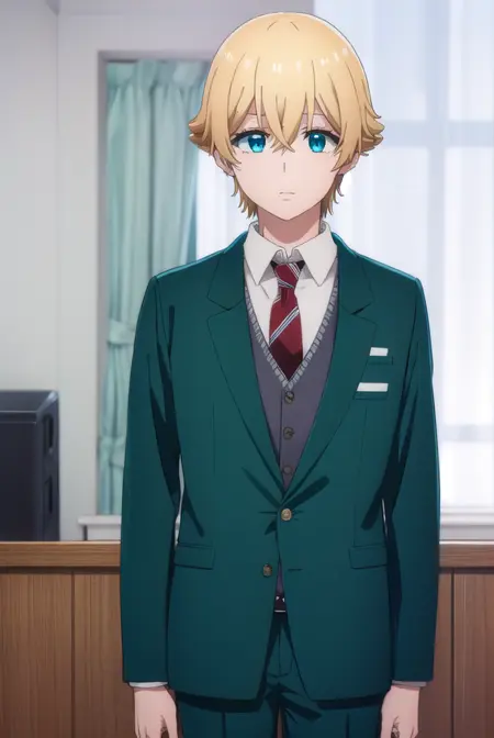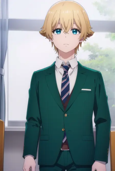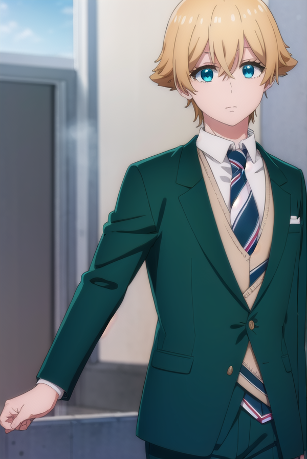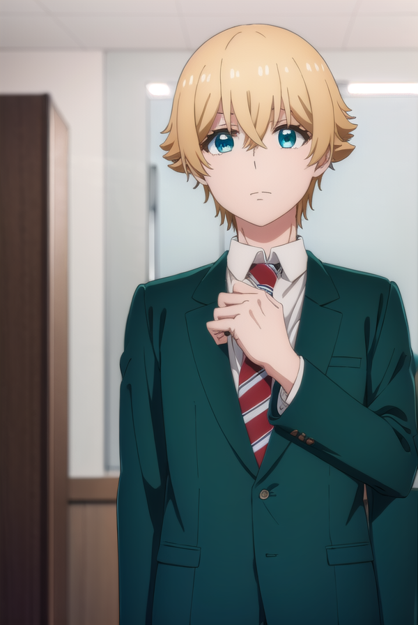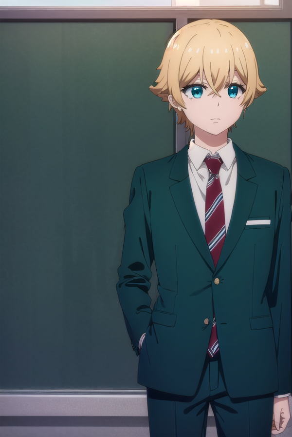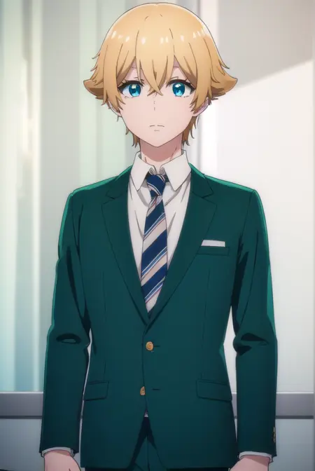 kousuke misaki, short hair, blue eyes, blonde hair, hair between eyes,