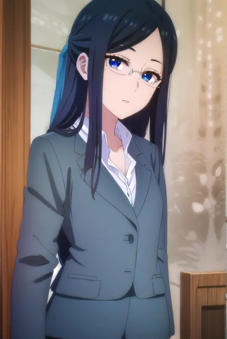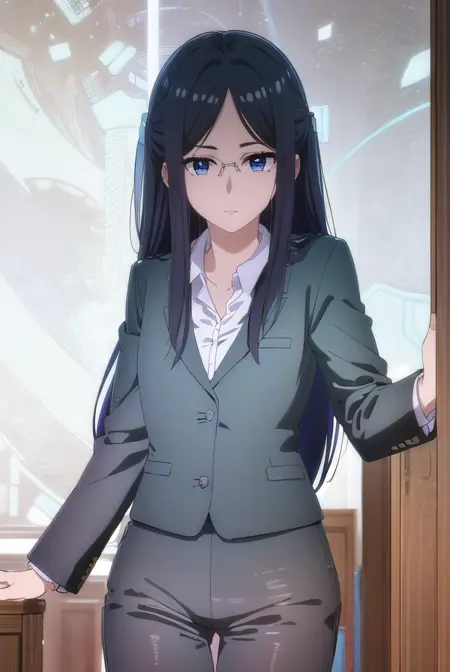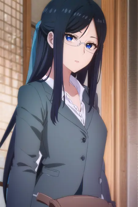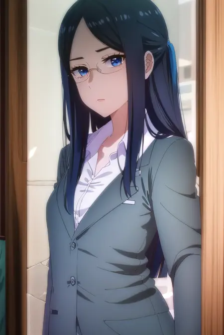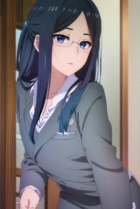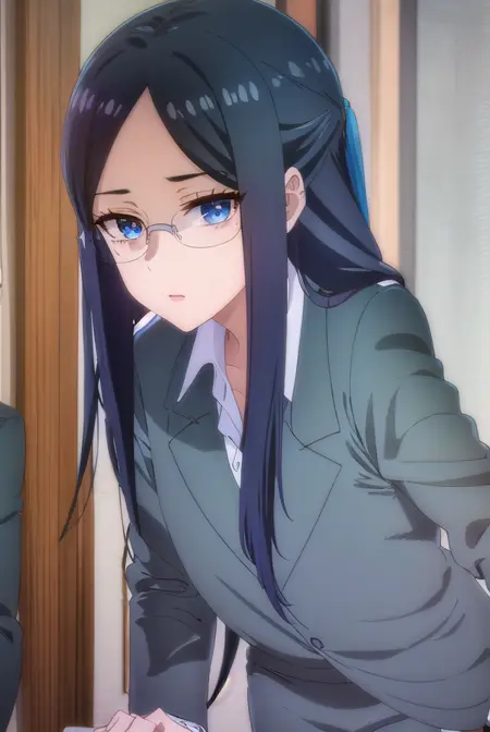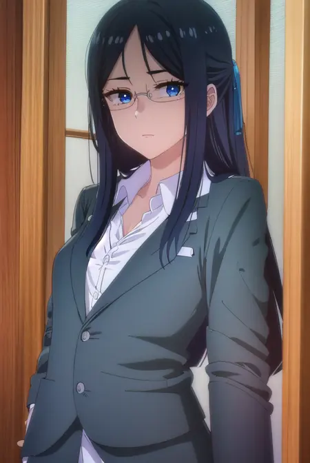 misaki gundou、長い髪、青い目、黒髪、眼鏡、ほくろ、目の下のほくろ、唇、成熟した女性、(分け目のある前髪:1.5)、