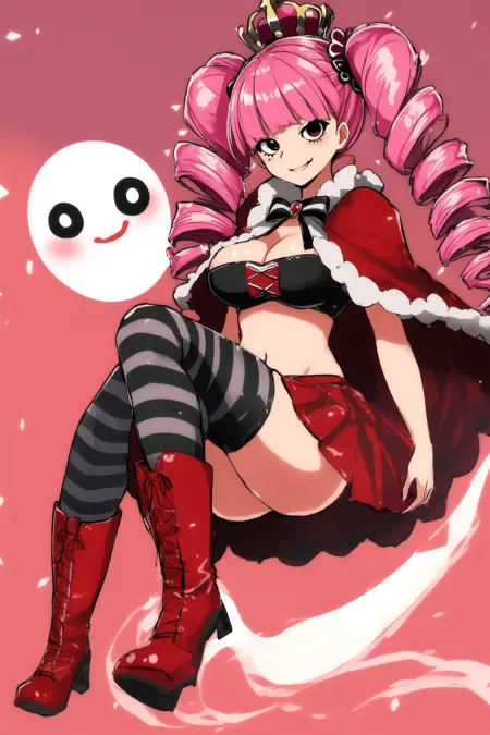 ポジティブプロンプトに "レッドケープレット、ピンクのネクタイ、ストライプのハイソックス、クロップトップ、レッドスカート、そして レッドブーツ" を加えると、タイムスカイプ前の衣装の統一感が向上します。また、disc-shaped eyes、black eyes といったトリガー語で、ペロナの目のかたちを再現できます。