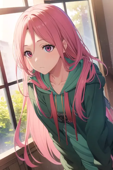 さつきももい、長い髪、ピンクの髪、(赤い目:1.3)、(分け目のある前髪:1.5)、目の間に髪、
