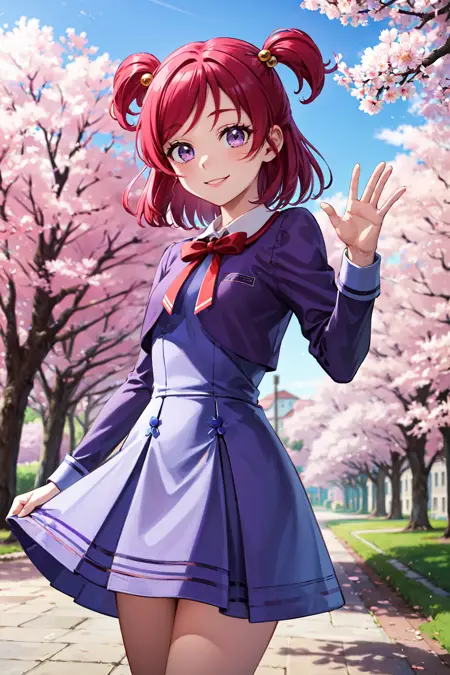 • bbnozomi, 속눈썹, 짧은 머리, 양측 올린 머리, 머리 고리, 머리 장식, 작은 가슴, 교복, 리본, 드레스, 보라색 드레스, 긴 소매, 치마, 보라색 치마, 양말, 파란색 양말, 신발