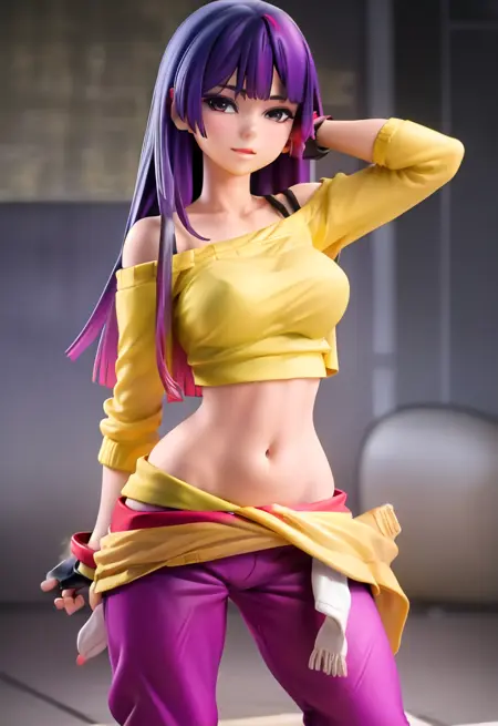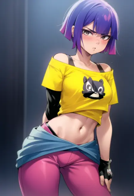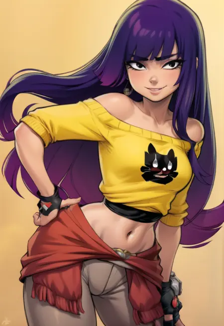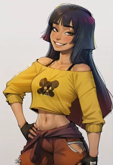 의상을 생성하는 데 도움이 되는 태그: 노란 셔츠, 오프 숄더, 배꼽, 바지, 허리에 감긴 스웨터, 손가락 없는 장갑