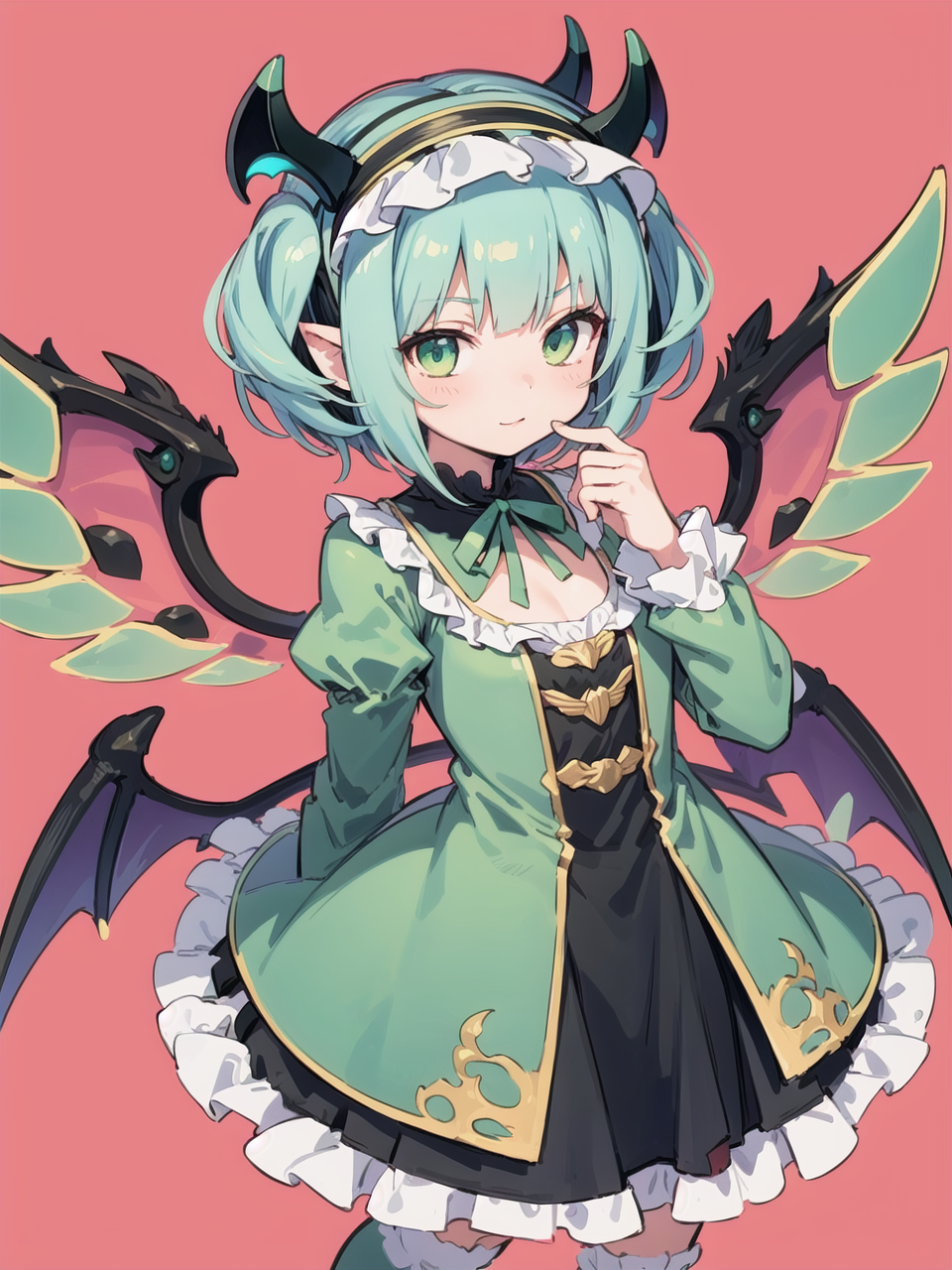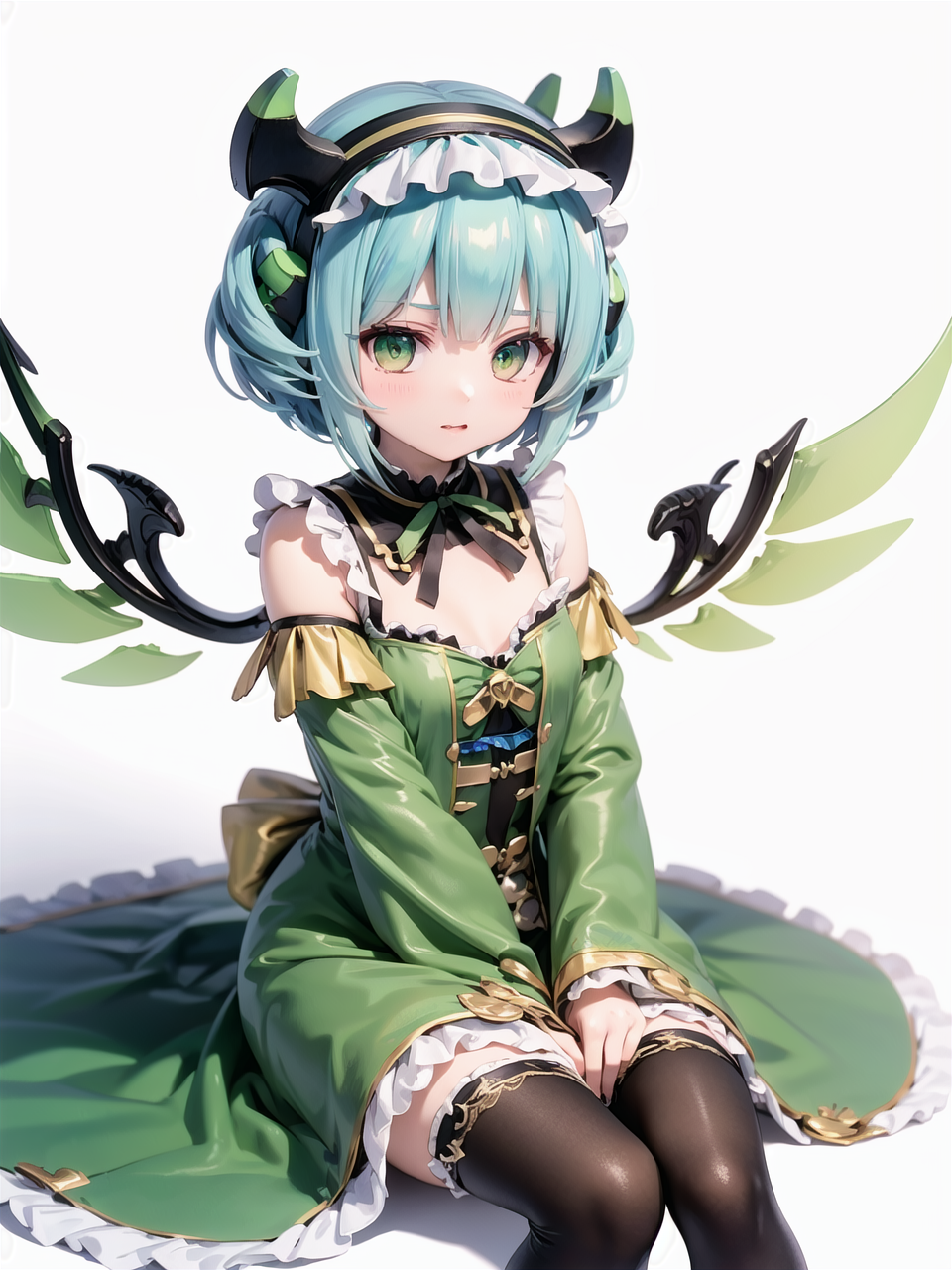 PADastaroth, wings, green hair, hairband, short hair, dress, frills, green eyes, green dress, demon horns,