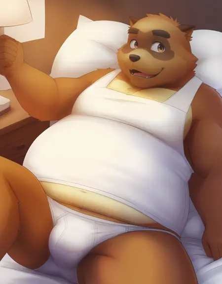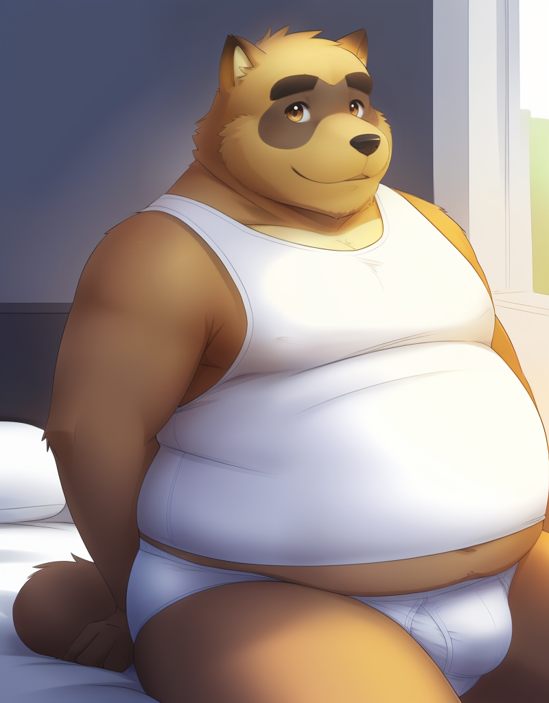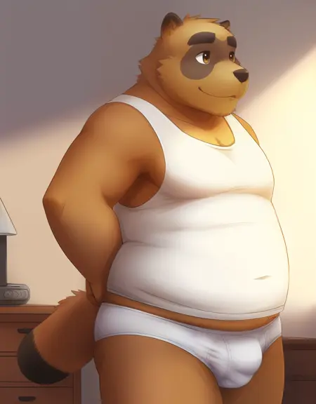 Related words : brown fur, two-tone fur, body fur, brown hair, brown eyes, tareme, thick eyebrows, dog boy, dog ears, raccoon ears, animal ears, animal nose, snout, old man, sleeveless, shirt, white male underwear, blush