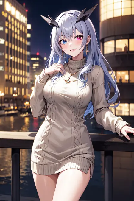 衣装2aaforte, long hair, twintails, hair ornament, heterochromia, breasts, earrings, black choker, blue necktie, collared shirt, white shirt, harness, long sleeves, pleated skirt, black skirt, thigh strap