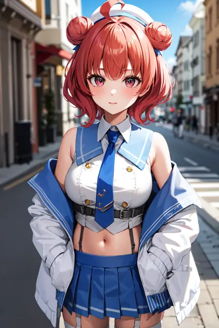 복장1aaakari, 단발머리, 더블 버니, 아호게, 베레모, 흰색 머리장식, 가슴, 파란색 넥타이, 소매 없는 셔츠, 흰색 셔츠, 어깨 드리우기, 흰색 재킷, 열린 재킷, 복부 노출, 접힌 치마, 파란색 치마, 기터 스트랩, 흰색 허벅지 양말