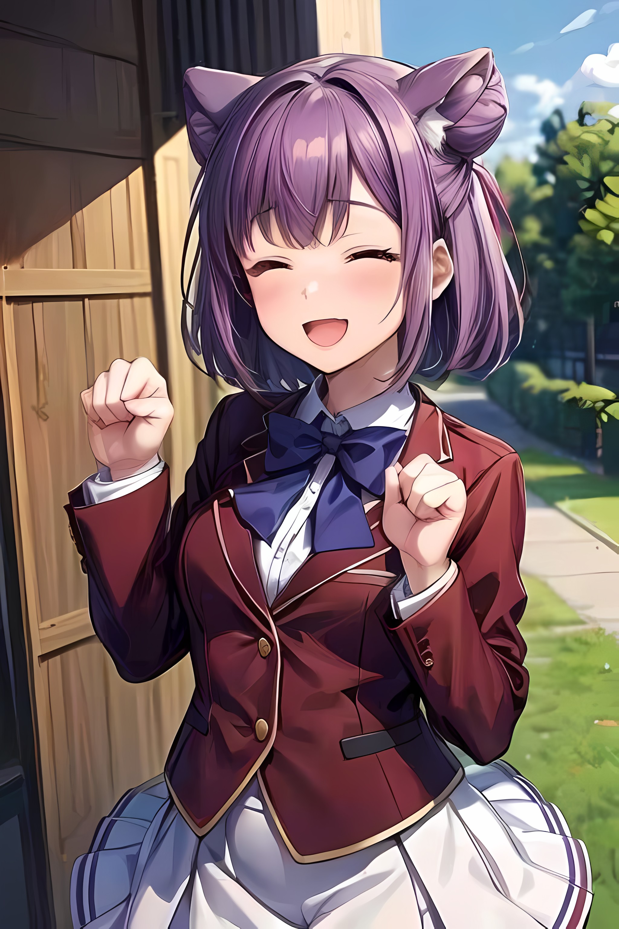 1girl, tachibana akane, purple hair, hair bun, double bun, yellow eyes