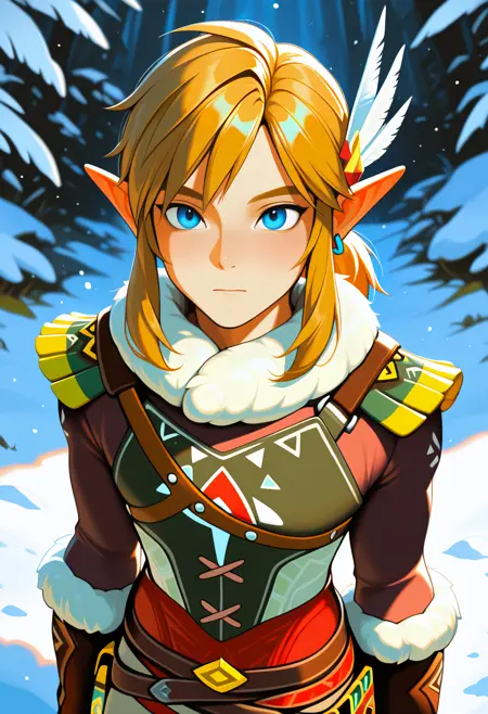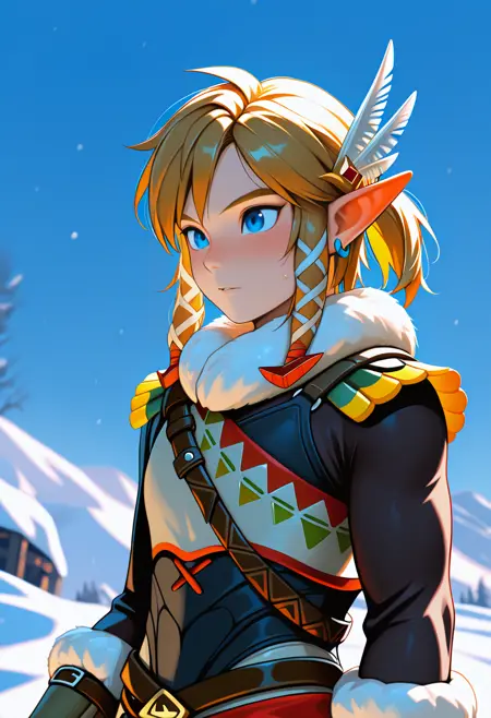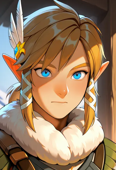 snowquill, link, 1boy, male focus, gloves, fingerless gloves, boots, bird, solo, blue eyes, fur trim, feathers, hair ornament,
