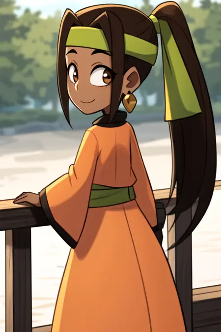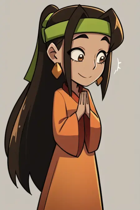 1girl, solo, brown eyes, black hair, green headband, long hair, orange dress, long dress, long sleeves, wide sleeves, sash, child