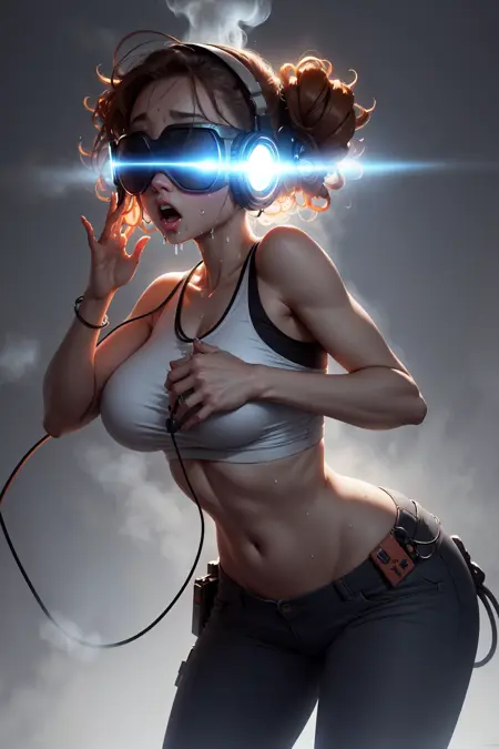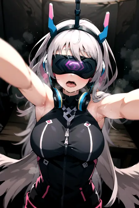 spirals, head-mounted display, covered eyes, tinted eyewear, saliva, sweating, drooling, open mouth, :o, heavy breathing, steaming body, headphones, glowing, salute - 私が好んで使うタグの組み合わせ。