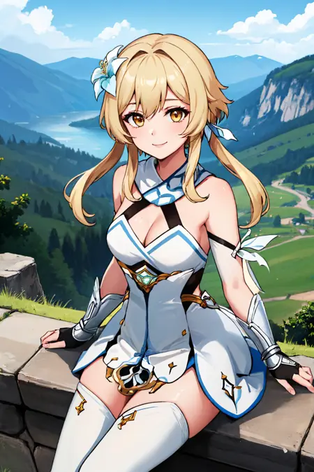 デフォルトの衣装: luminedef, hair flower, white dress, detached sleeves, gloves, white thighhighs, scarf, bare shoulders, cleavage