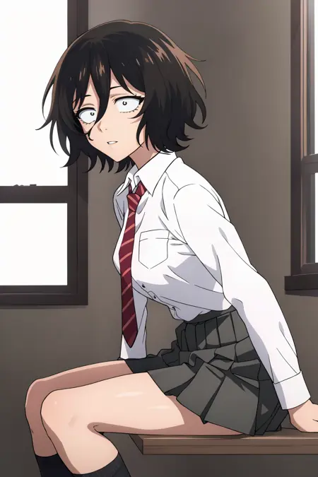 裙子、领带、百褶裙、条纹领带、衬衫、条纹、白色衬衫、衬衫塞进裙子里、红色领带、灰色长袖裙、袖子卷起