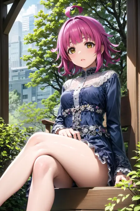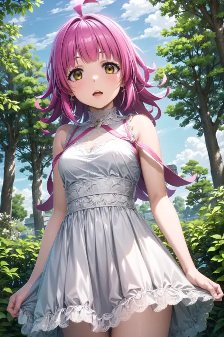 Tags: 1girl, solo, tennoji rina, pink hair, bangs, ahoge, yellow eyes, (blunt bangs:1.1), short hair, blunt ends