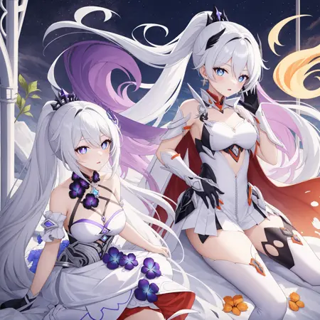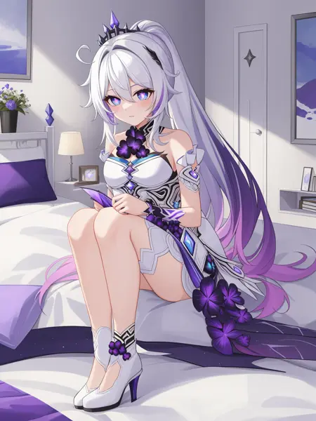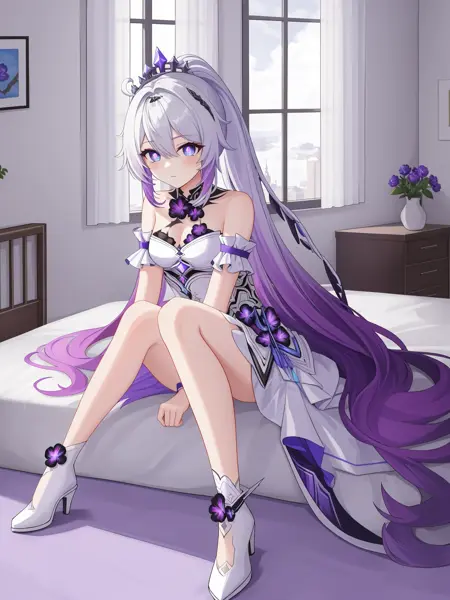 终焉herrscher of finality:kiana kaslana, kiana final, +_+,blue eyes,purple pupils,white gradient purple dress,purple wings,black hair ornament,silver crown,high heels,black flowers,white footwear,ponytail,