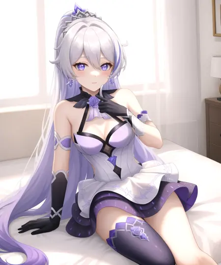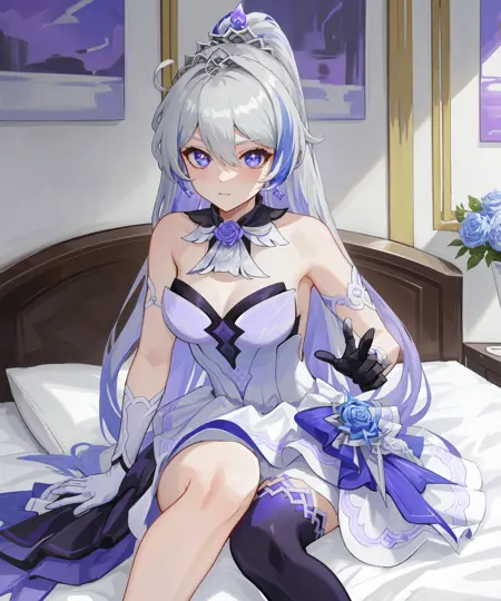 时砾逐光herrscher of flamescion extra:kiana kaslana, kiana kaslana \\\(shilizhuguang\\\),evening gown, purple earrings, ponytail,purple gloves,white gloves,mismatched gloves,purple crown,purple rose,single thighhigh,purple thighhigh