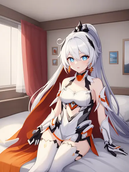 薪炎herrscher of flamescion:kiana kaslana,kiana kaslana \\\(herrscher of flamescion\\\),ponytail,white thigh boots,white armor,orange earrings,torn cape,black hair ornament,gauntlets,blue eyes,white thighhighs
