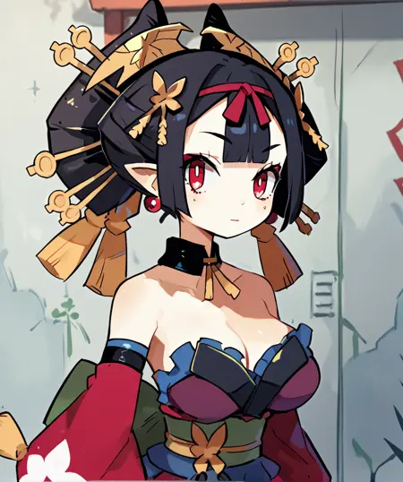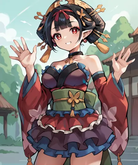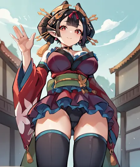 purple kimono, detached collar, detached sleeves hair ornament, wide sleeves, bare shoulders, cleavage, earrings, - blue underwear, thigh-highs, sandals, bow,