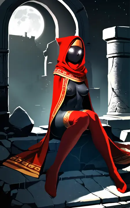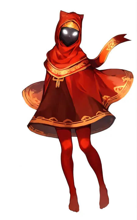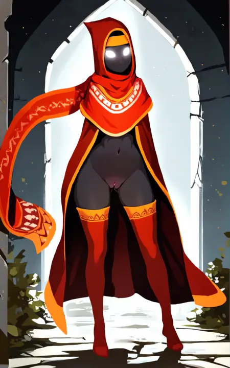 For her Outfit: hooded cloak, hood, hood up, robe, ofuda, scarf, red thighhighs OR red legwear, headband, golden headband**