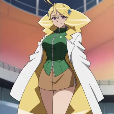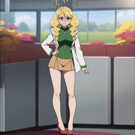 1 girl, blonder hair, purple eyes, two braids, glasses, hair Antenna, labcoat, brown miniskirt, green jacket, dark red high heels