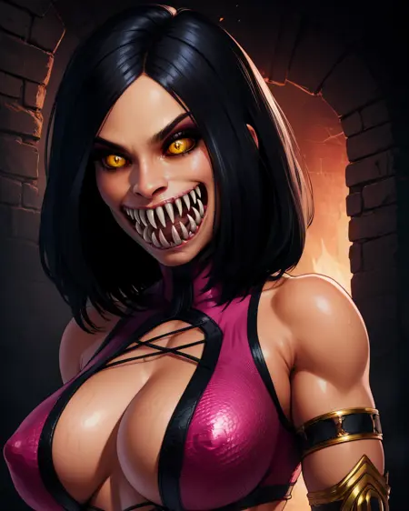 Mileena,黑色头发,中等长度头发,黄色眼睛,分裂瞳孔,发光眼睛