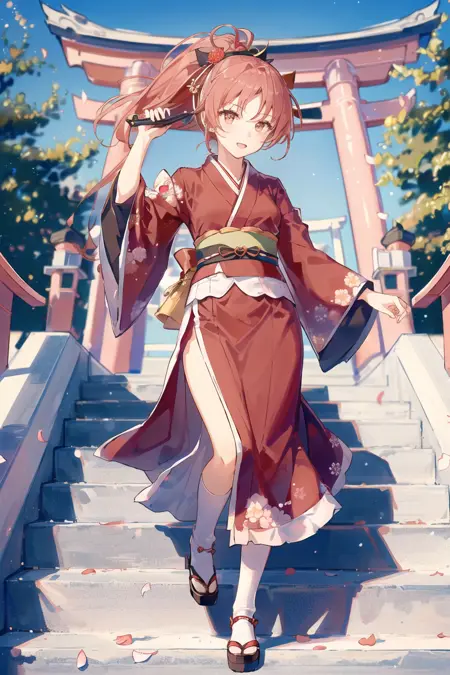옷을 다시 해석하고 싶다면 가중치를 주는 방식으로 프롬프트할 수 있습니다. 예를 들어, (빨간 기모노를 입은 소녀:1.2)처럼요. 그 결과 예시를 첨부해 놓았습니다.