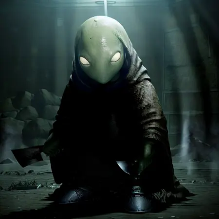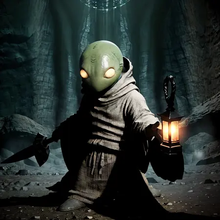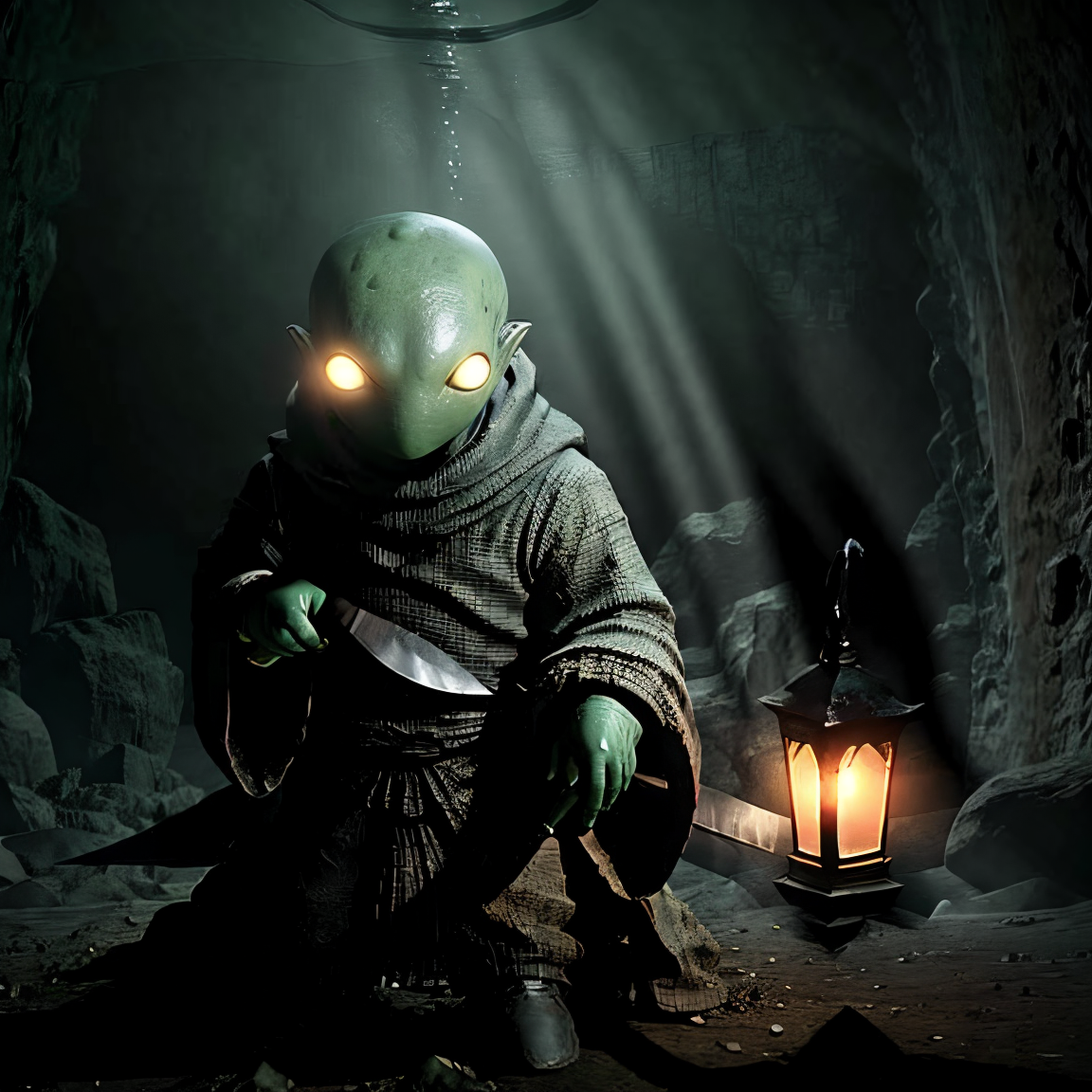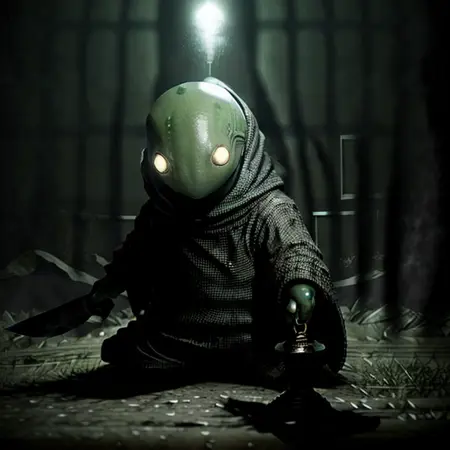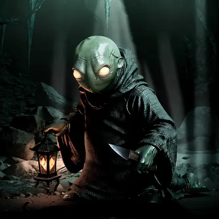 Tonberry from the final fantasy games. Sometime I am realizing is that simple characters are often the hardest. Known issues: Sometimes he gets extra eyes not sure why this is happening the training data is good. Knife and lantern: sometimes he has two knives sometimes he two lanterns more often then not its one of each.