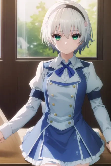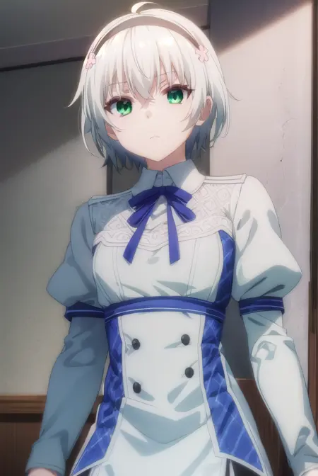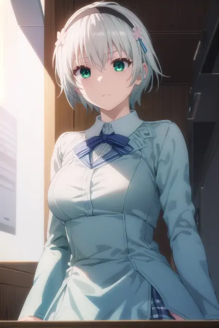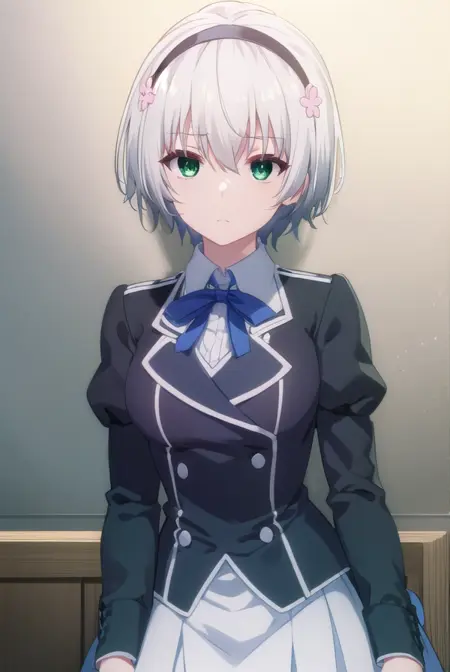 shizuku kurogane, short hair, hair ornament, (green eyes:1.3), flower, white hair, hairband, hair flower,