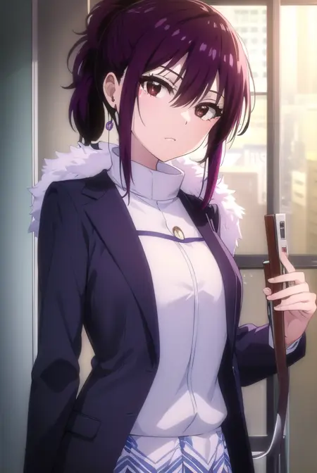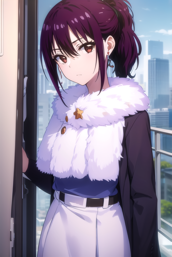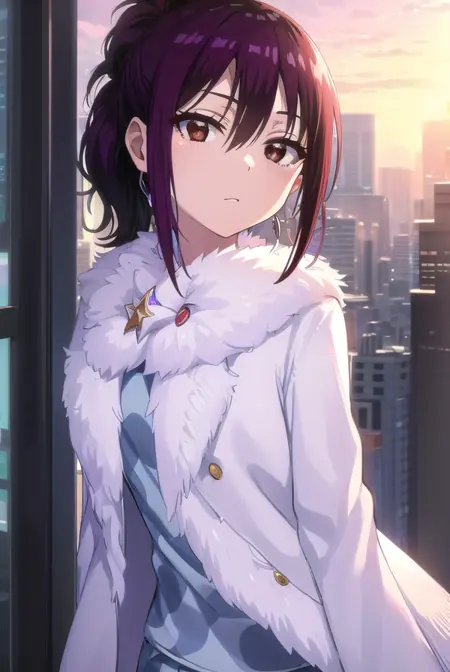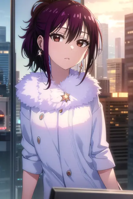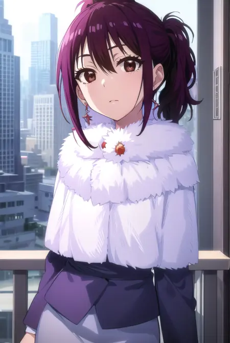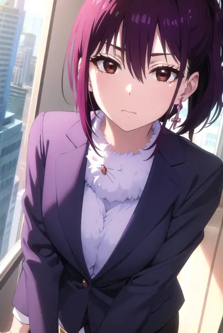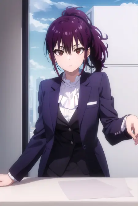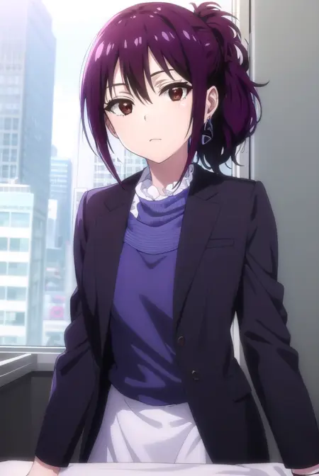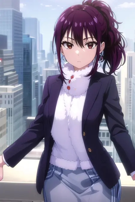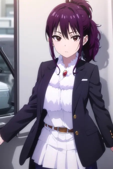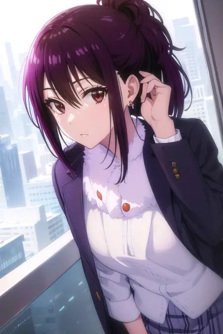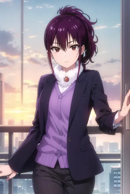 hana kirisaki, purple hair, (brown eyes:1.3), ponytail, short hair, hair between eyes,