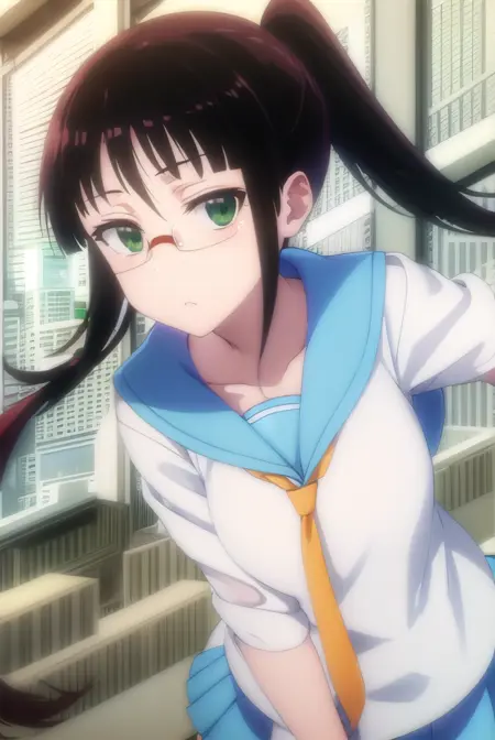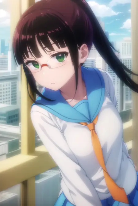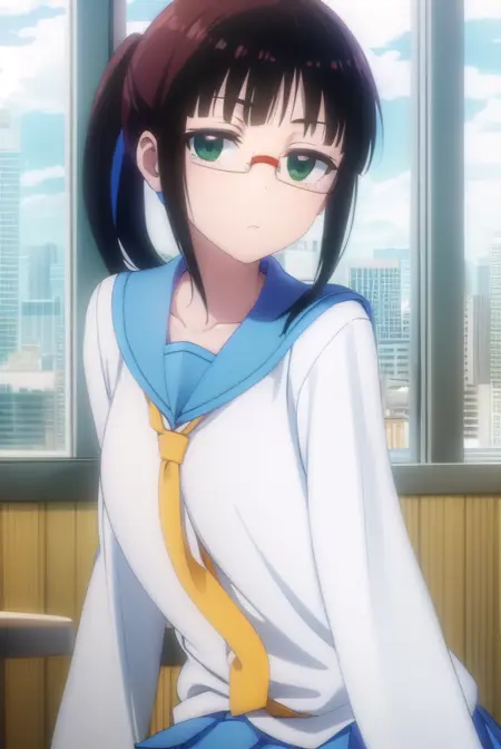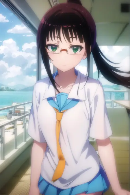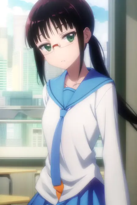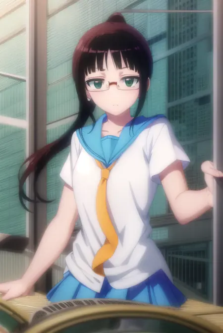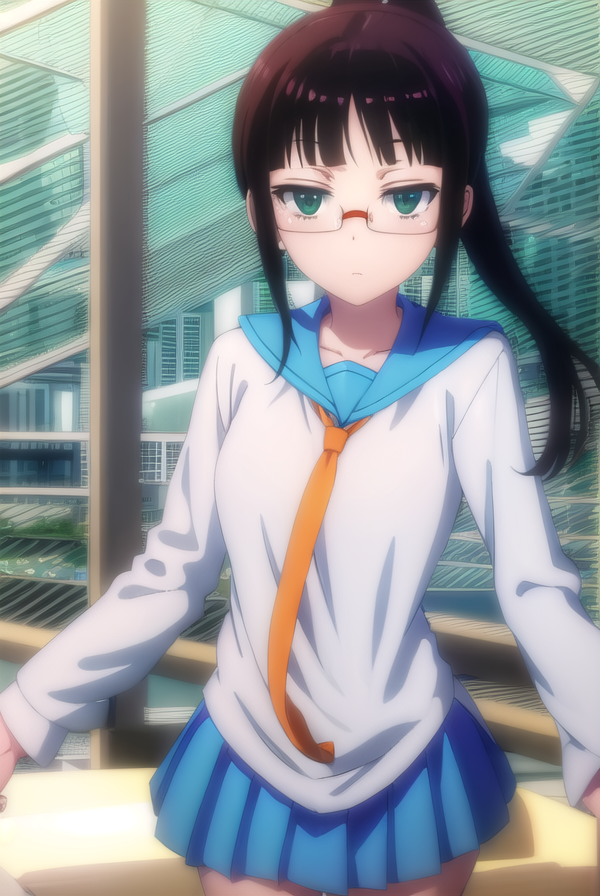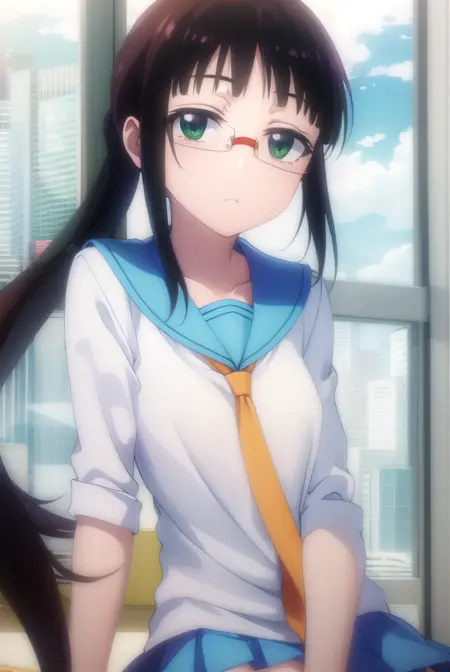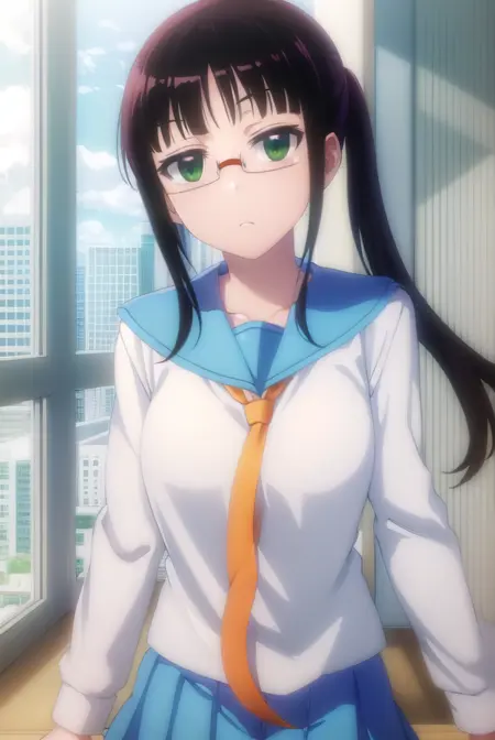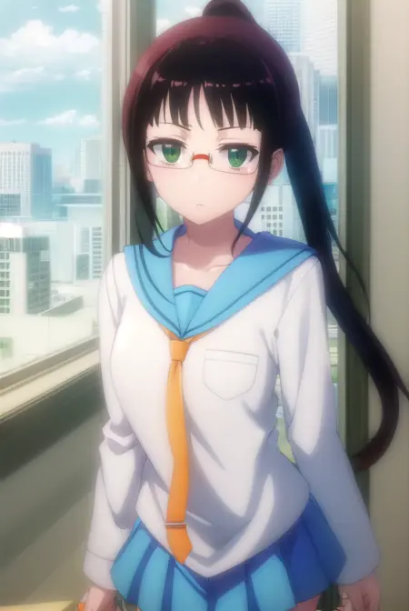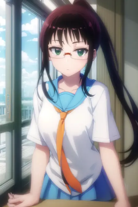 ruri miyamoto, long hair, bangs, black hair, (green eyes:1.3), ponytail, glasses, blunt bangs,