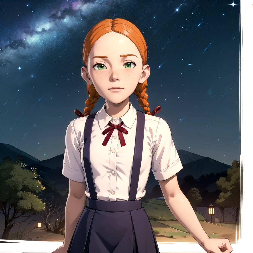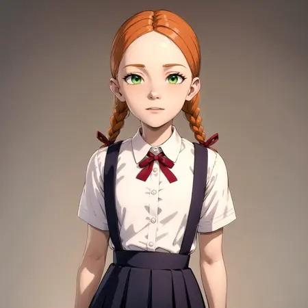 1girl, solo, Jenny Bennett, green eyes, freckles, orange hair, twin braids, red ribbon, white collared shirt, school uniform, skirt, suspenders, short sleeves,