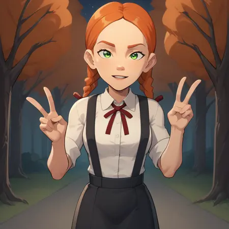 Jenny_Bennett , 1girl, solo, orange hair , twin braids, green eyes, red ribbon,