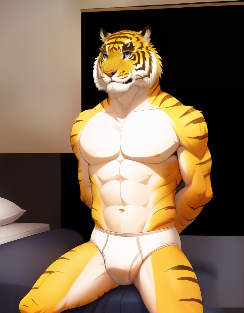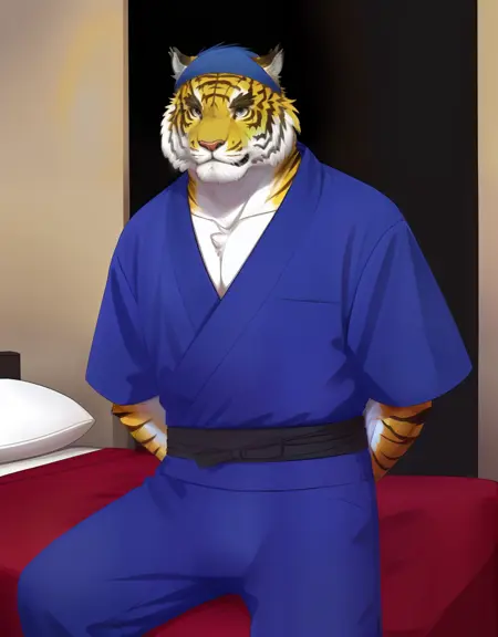 相关词:老虎条纹,白色毛发,黄色毛发,双色毛发,身体毛发,白发,短发,中发,面部毛发,胡须,蓝眼睛,浓眉,老虎尾巴,老虎男孩,老虎耳朵,动物耳朵,动物鼻子,吻部,老人,蓝色头巾,发带,头巾,袴,和服,短袖,衣物下勃起,白色男性内衣