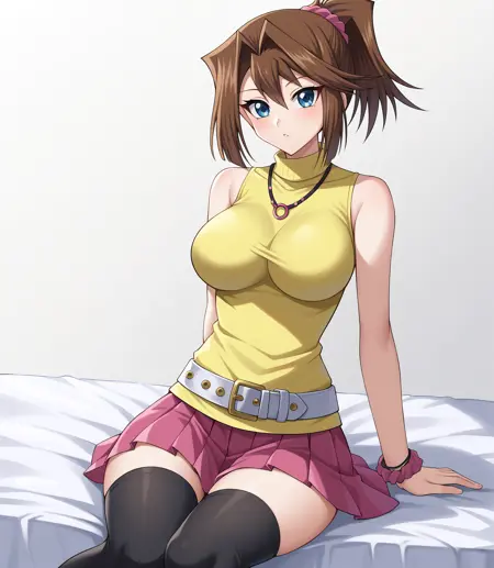 shirt, skirt, thighhighs, bare shoulders, jewelry, o-ring, pleated skirt, sleeveless, belt, miniskirt, necklace, bracelet, zettai ryouiki, sleeveless shirt, turtleneck, scrunchie, pink skirt, black thighhighs, yellow shirt, sleeveless turtleneck, yu-gi-oh!