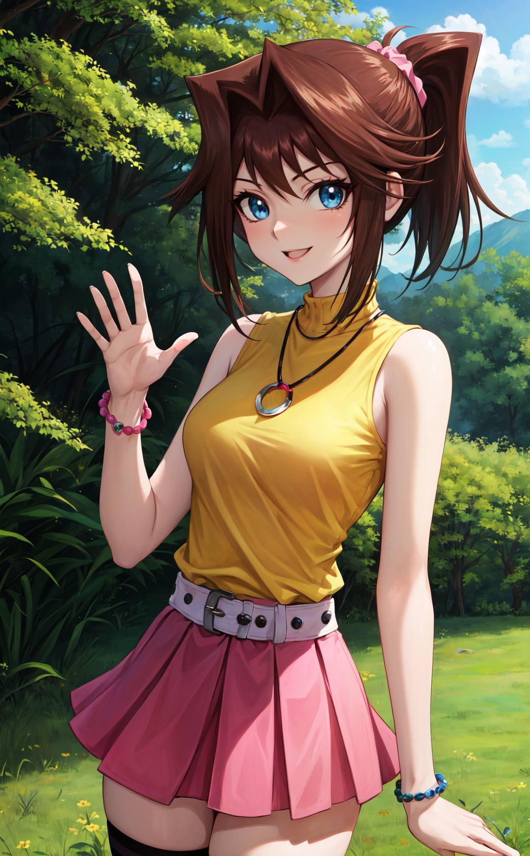 shirt, skirt, thighhighs, bare shoulders, jewelry, o-ring, pleated skirt, sleeveless, belt, miniskirt, necklace, bracelet, zettai ryouiki, sleeveless shirt, turtleneck, scrunchie, pink skirt, black thighhighs, yellow shirt, sleeveless turtleneck, yu-gi-oh!
