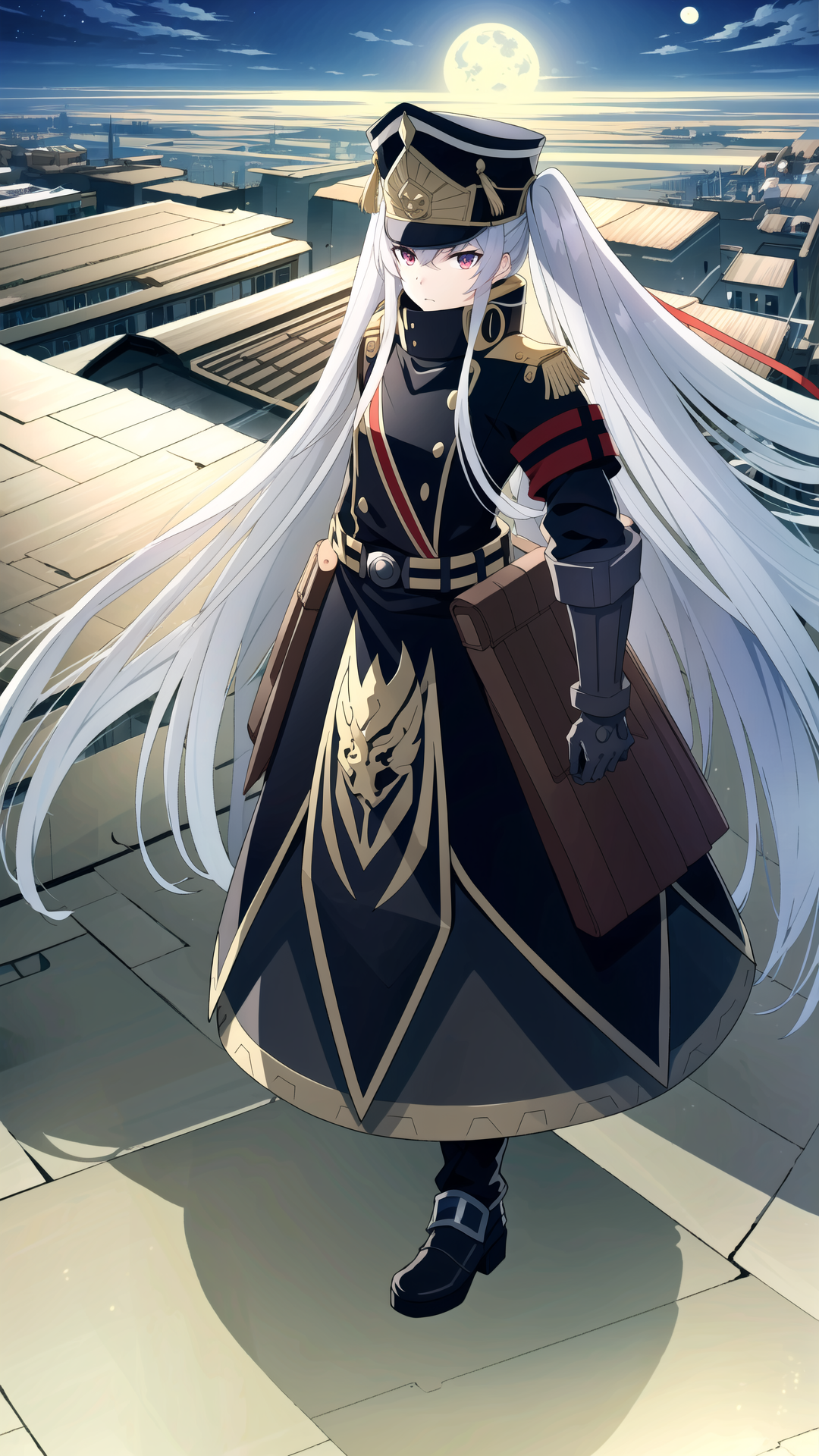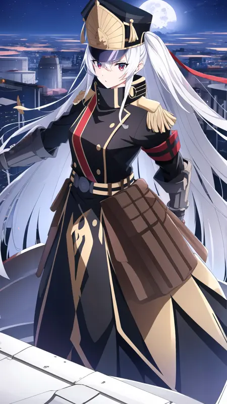 altair_recreators, 1girl, solo, long hair, red eyes, hat, ribbon, very long hair, white hair, uniform, military, military uniform, gauntlets, shako cap,