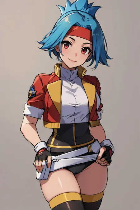 기본 옷차림: 헤드밴드, 길이 단축된 자켓, 짧은 소매, 손가락 없는 장갑, 검은 허벅지 길이 양말, 벨트
