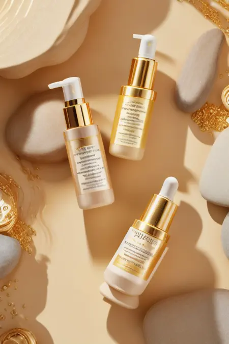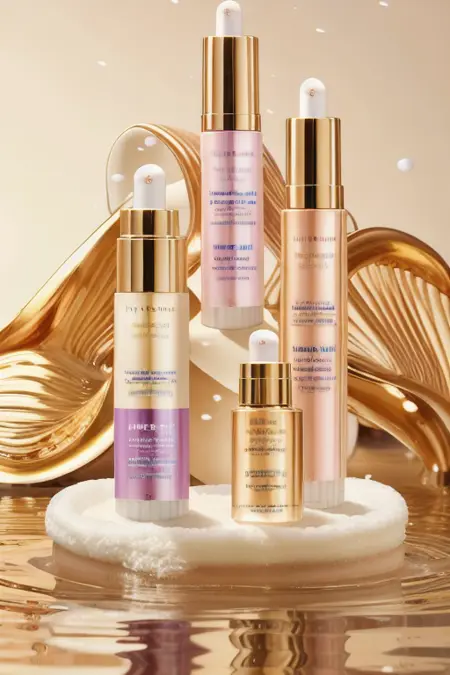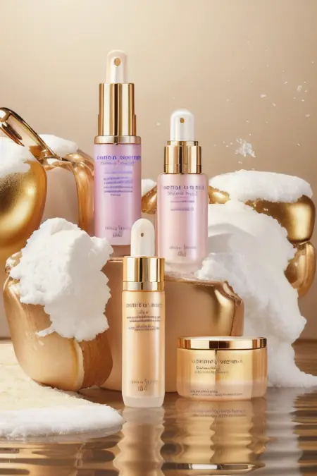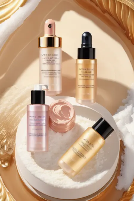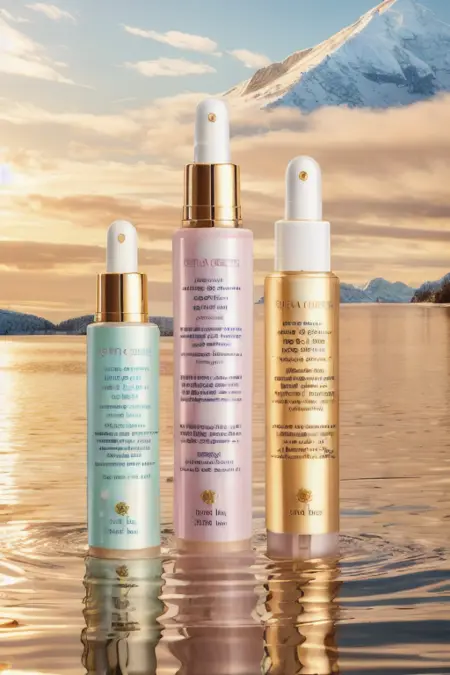 (Hyper quality:1.41),High resolution,Colorful,Extreme Details,Vivid Colors,(masterpiece:1.42),skin care product,on the golden water waves,the background is snow-capped mountains,exquisite light source,photographic sense,<lora:MooMoo-Golden Cosmetic:1>,