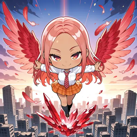 XenosMagica: xenosmagica, hair ornament, hairband, red dress, detached collar, wing collar, short necktie, gem, bare shoulders, cleavage, black gloves, elbow gloves, fingernails, feathered wings, waist bow, thigh boots, high heel boots