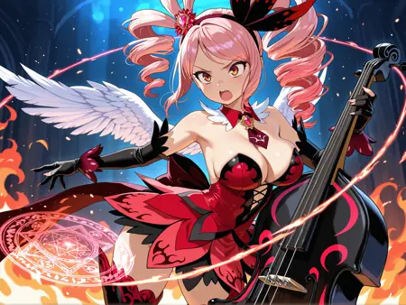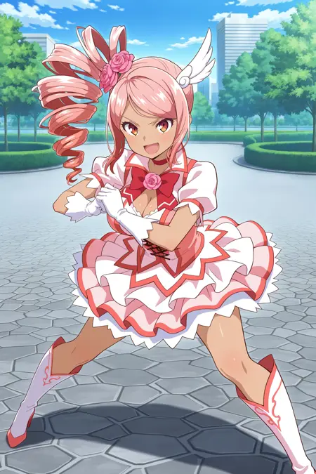 Magica2019: magica2019, hair flower, pink rose, wing hair ornament, choker, pink dress, short sleeves, red bowtie, brooach, cleavage, white gloves, layered skirt, knee boots, bow, high heels