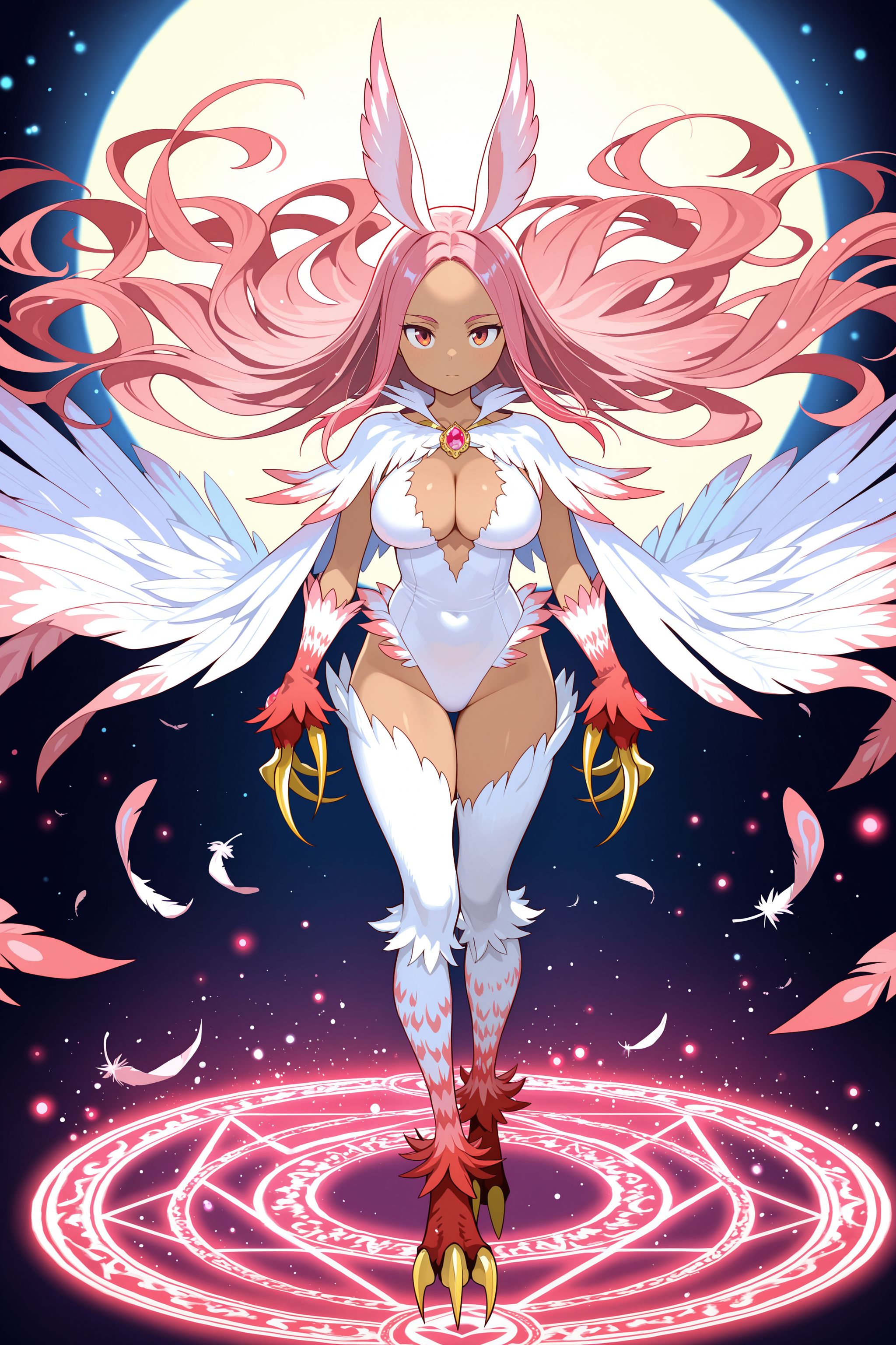 UltimateMagica: ultimatemagica, monster girl, harpy, animal ears, forehead, very long hair, floating hair, white leotard, cleavage, gem, feathers, claws, bird legs, talons