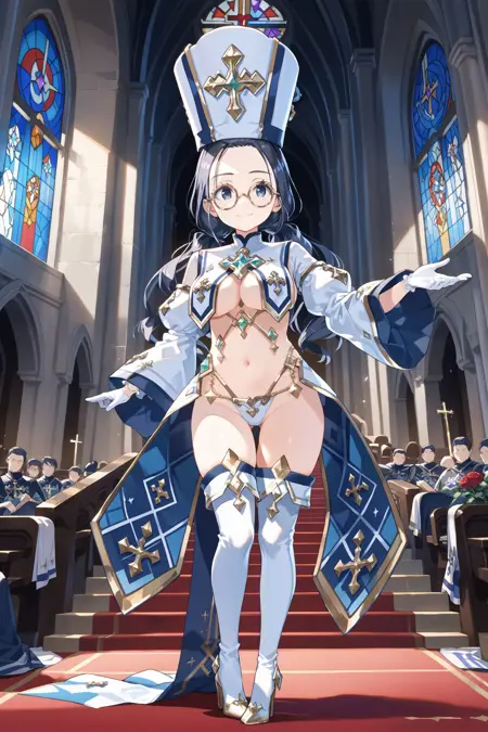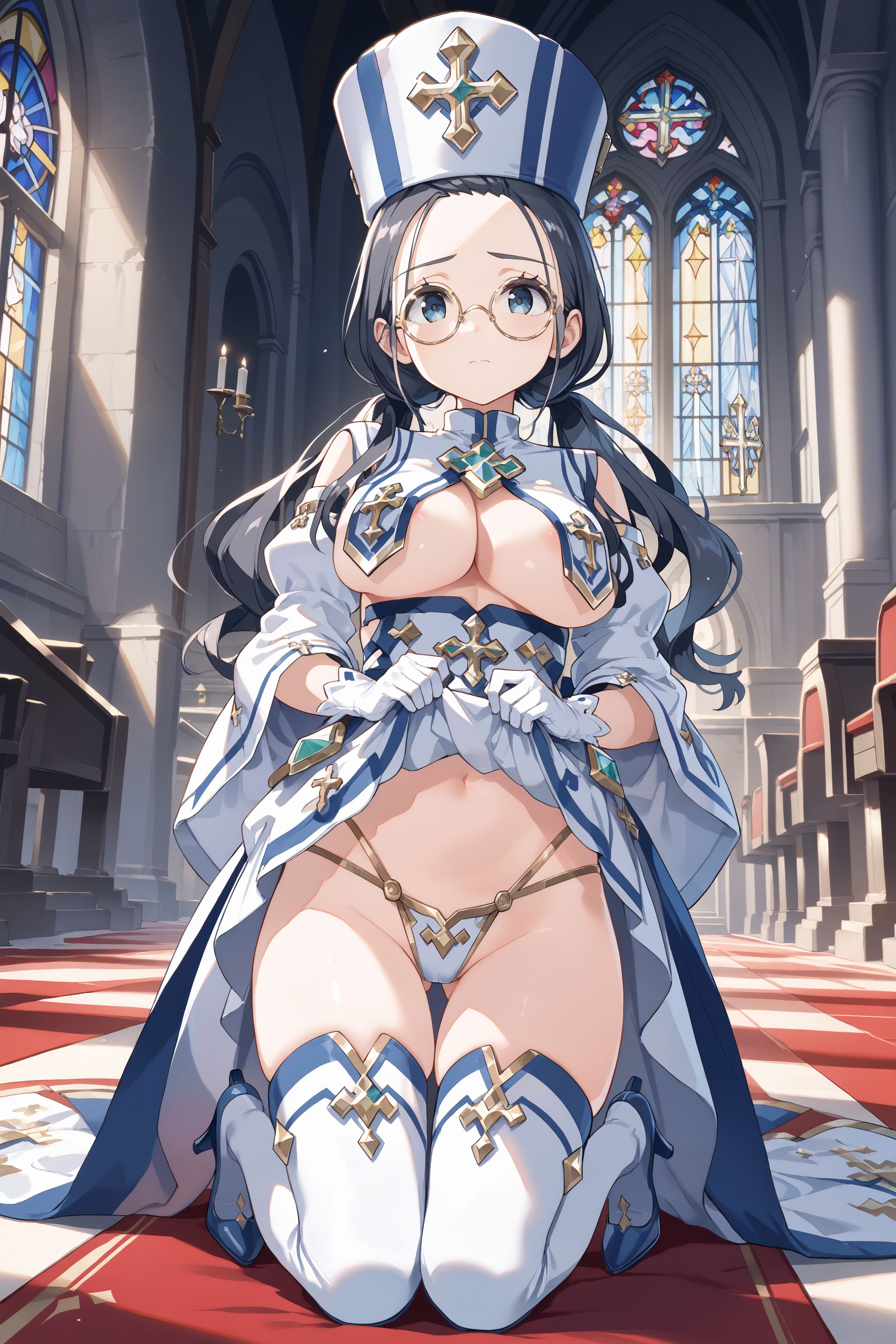 AWLII: awlii, mitre, tall hat, cross, round eyewear, revealing clothes, breast curtains, gem, underboob, navel, wide_sleeves, white gloves, highleg panties, thigh boots, high heels,