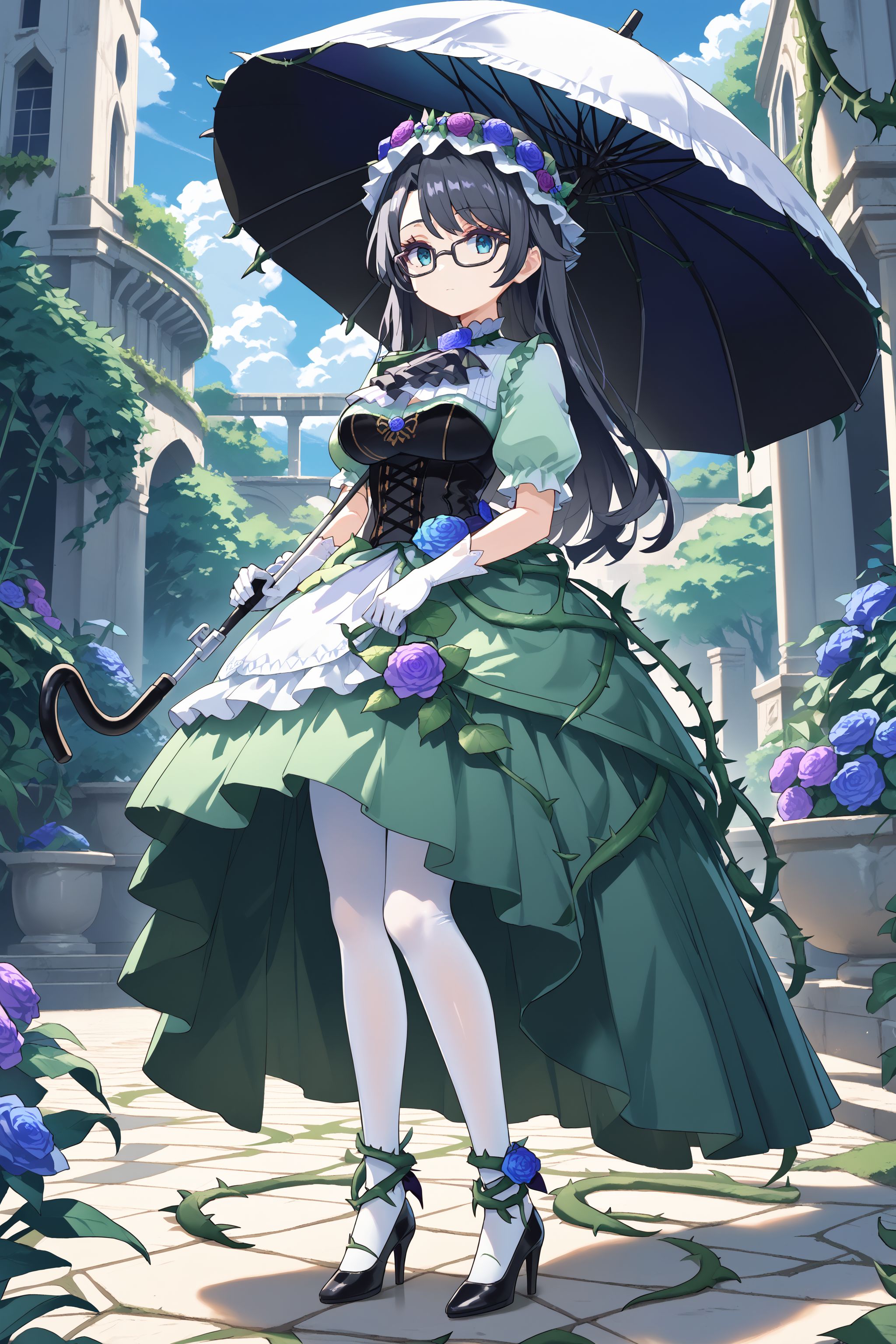 ThornPrincess: princessform, white headwear, head wreath, blue rose, purple rose, vines, green dress, ascot, puffy sleeves, corset, white gloves, elbow gloves, long skirt, plant, thorns, white pantyhose, black footwear, high heels