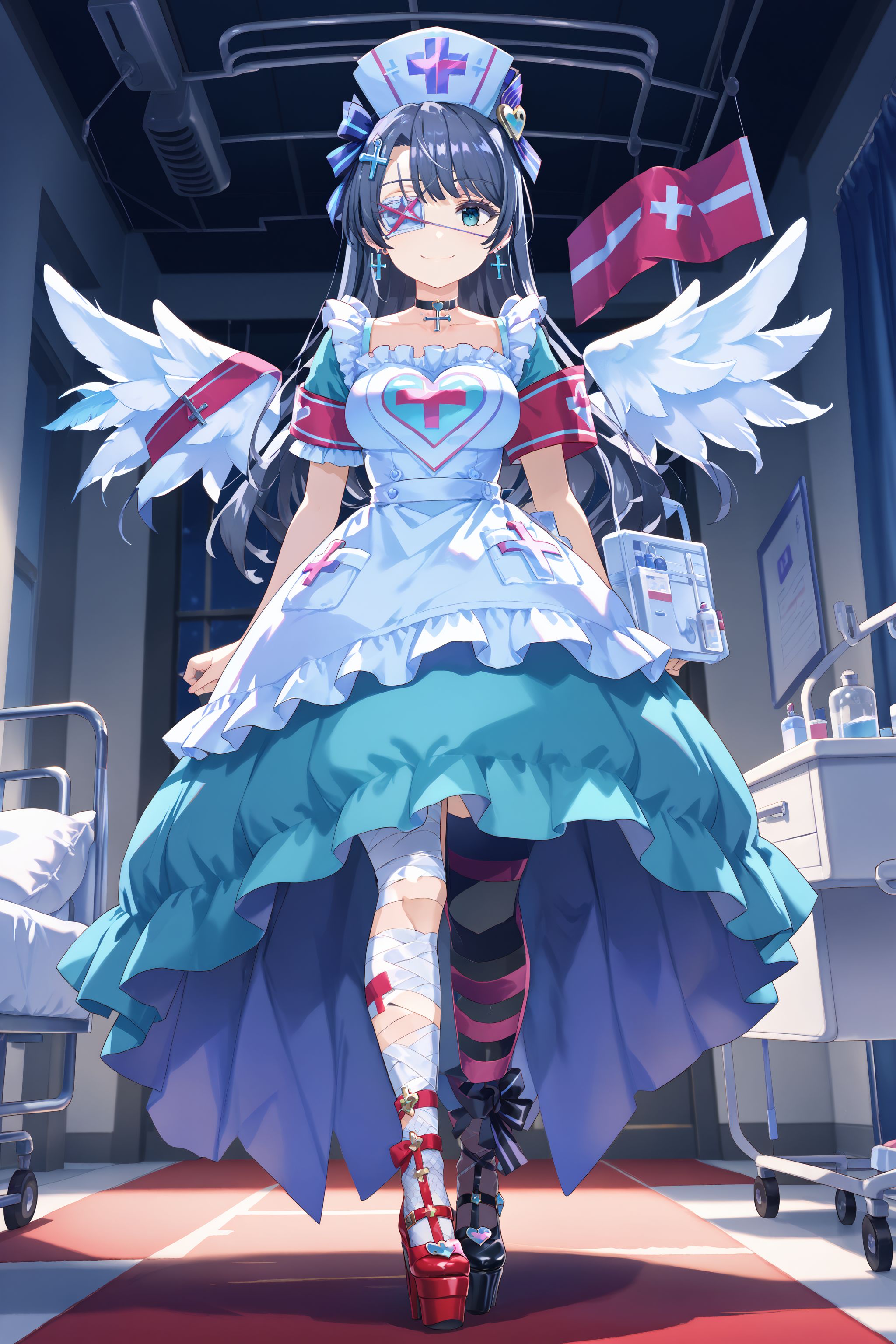 MagicaMaiden: magicamaiden, nurse cap, hair bow, hair ornament, eyepatch, earrings, choker, aqua dress, heart, cross, puffy short sleeves, armband, apron, feather wings, long skirt, frills, mismatched legwear, striped, bandages, platform footwear, capsule, stuffed_bunny, platform footwear, heels