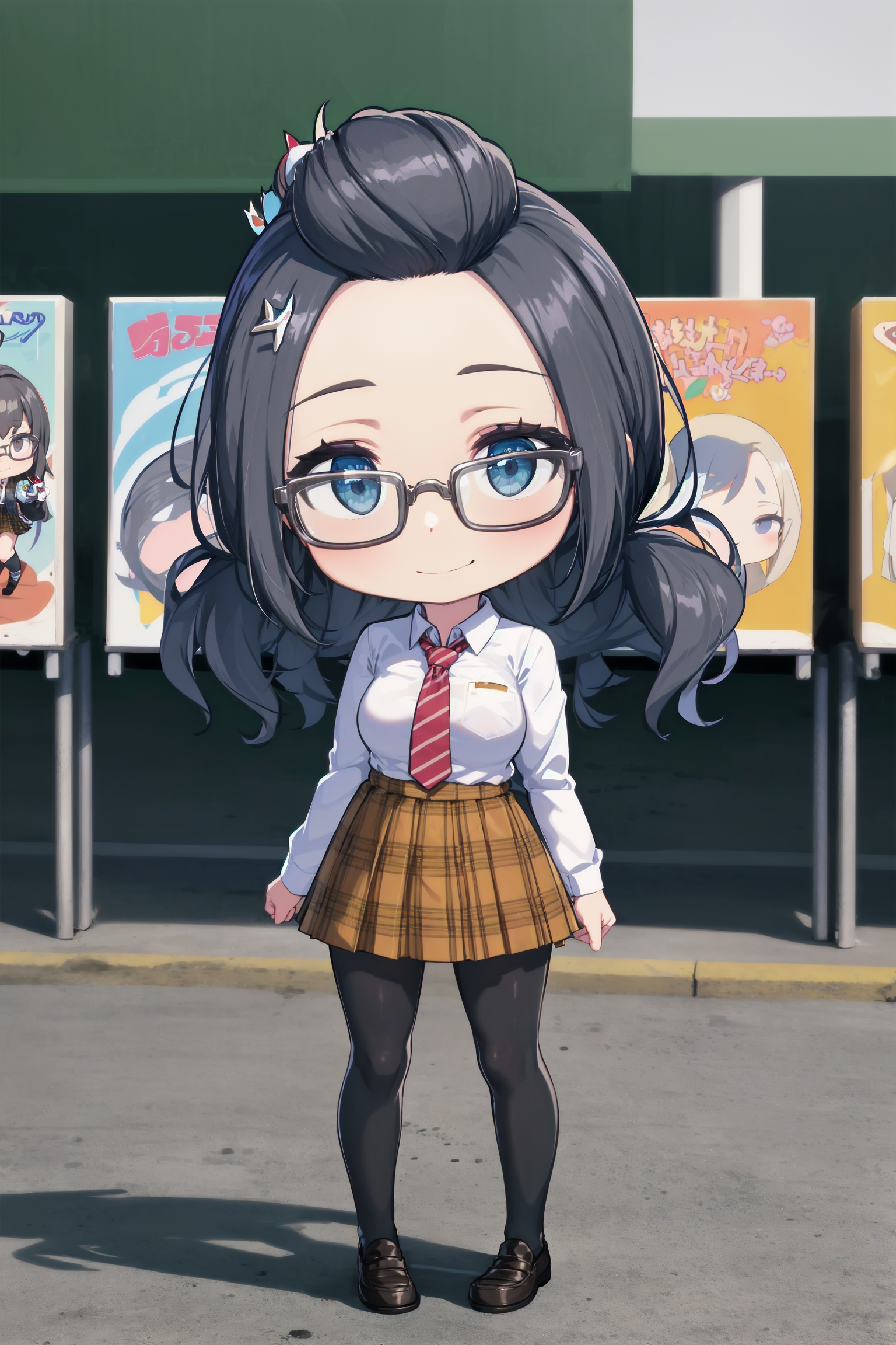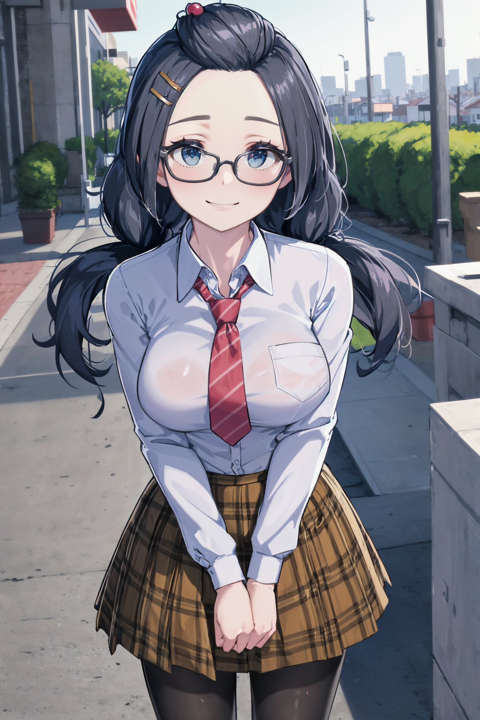 SchoolUniform: school uniform, hair ornament, white shirt, collared shirt, red necktie, striped necktie, long sleeves, orange skirt, plaid skirt, black pantyhose, loafers