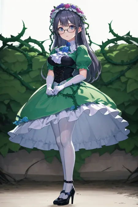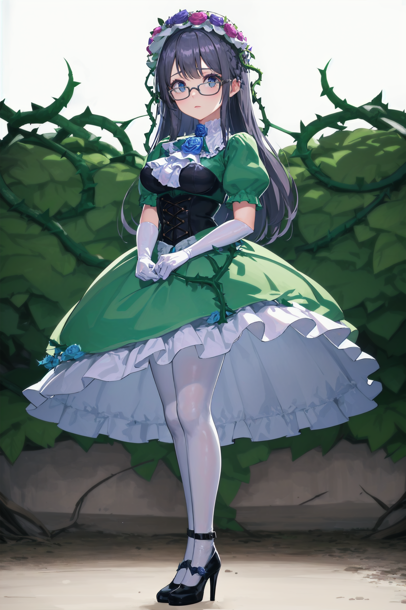 ThornPrincess: princessform, white headwear, head wreath, blue rose, purple rose, vines, green dress, ascot, puffy sleeves, corset, white gloves, elbow gloves, long skirt, plant, thorns, white pantyhose, black footwear, high heels