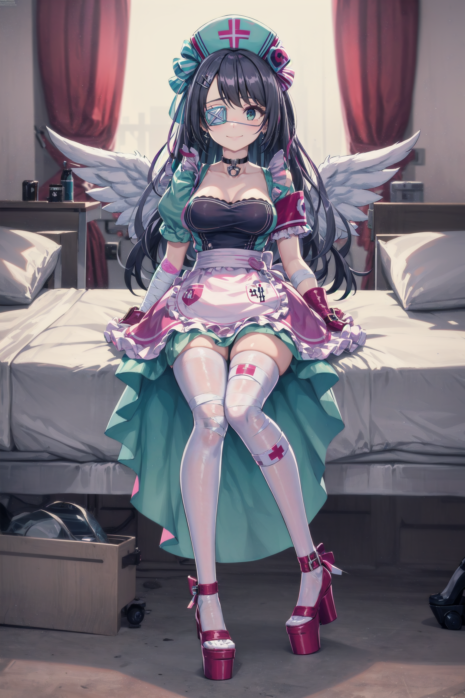 MagicaMaiden: magicamaiden, nurse cap, hair bow, hair ornament, eyepatch, earrings, choker, aqua dress, heart, cross, puffy short sleeves, armband, apron, feather wings, long skirt, frills, mismatched legwear, striped, bandages, platform footwear, capsule, stuffed_bunny, platform footwear, heels