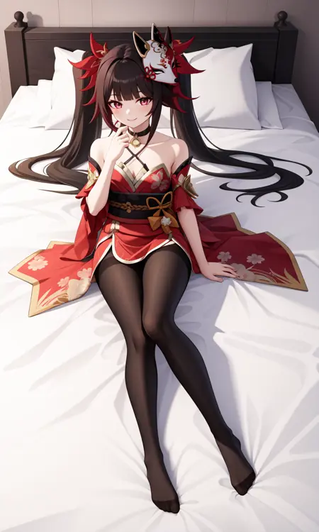 sparkle \\\(honkai: star rail\\\),1girl,solo,mask,twintails,fish,long hair,fox mask,smile,japanese clothes,bare shoulders,kimono,choker,bangs,cleavage,