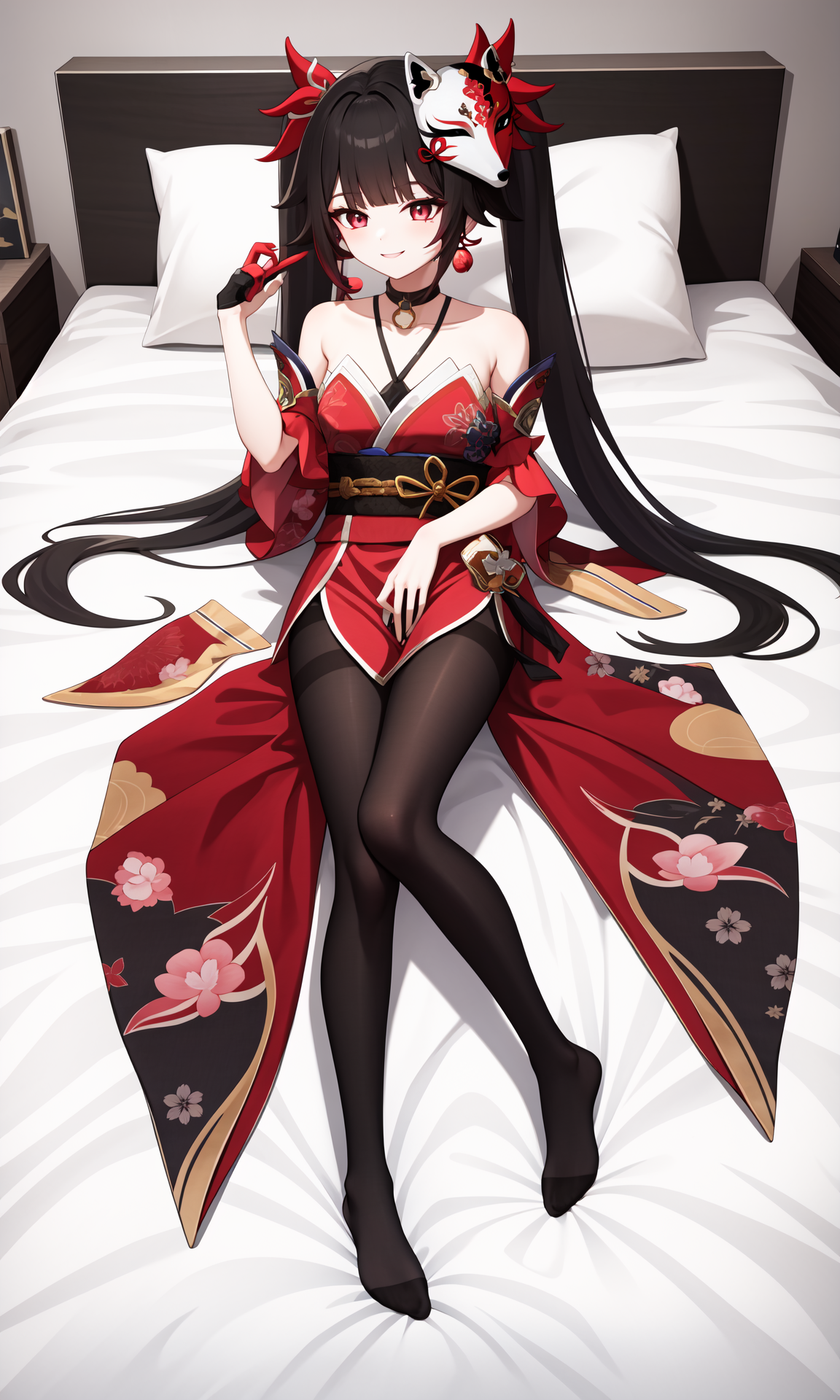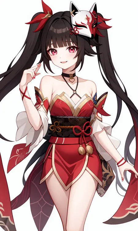 sparkle \\\(honkai: star rail\\\),1girl,solo,mask,twintails,fish,long hair,fox mask,smile,japanese clothes,bare shoulders,kimono,choker,bangs,cleavage,